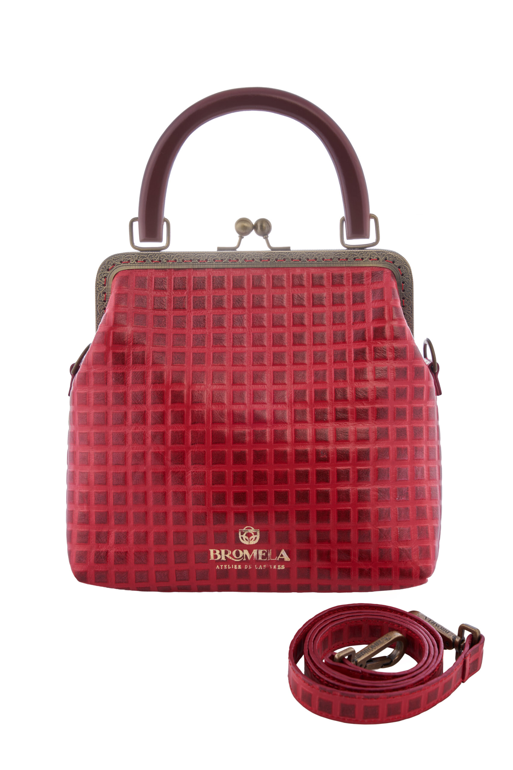 MATERIALES: Cuero genuino texturado, marco metálico, asa de madera.